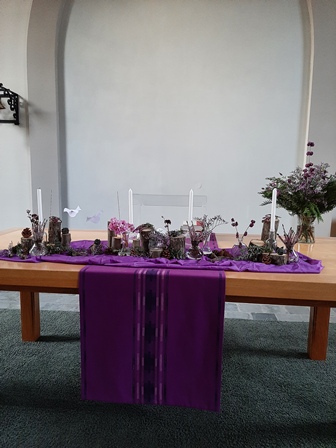 Vier kandelaars met kaarsen staan er en tussen de eerste en tweede kandelaar zweeft een enkel duifje. Op de boomstammetjes en in de flesjes donkere materialen. Paars is de kleur die ons tot inkeer roept. De donkere bessen en bloemen benadrukken het donker van de adventstijd. Eén kaars brandt. Maar dit donker wil ons niet verlammen. Het daagt ons uit om, net als de vijgenboom, open te blijven staan. Om te leren het mooie te zien in wat donker is, en de hoop te vinden die daar verscholen ligt.