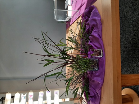 De rode takken van vorige week blijven staan. Ook in deze lezing speelt de liefde van de Geest een belangrijke rol, binnen en buiten de kerk. De hoop wordt verbeeld in bloembollen, teken van de komende lente en in de groene kleur. Groen is de kleur voor een goede toekomst. De palmbladeren worden tussen de takken van de waaier geklemd als teken van de feestelijke intocht. Palmbladeren met de V-vorm in het blad, teken voor vrede.